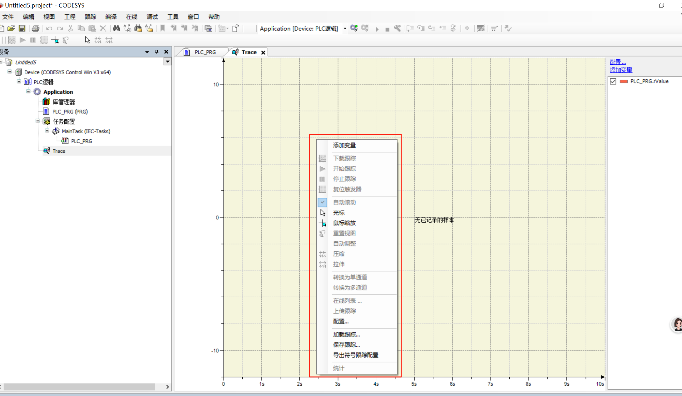 一、问题描述:在codesys工程中使用trace功能时,在Trace界面右键无反应,整个鼠标右键功能都没有反应。