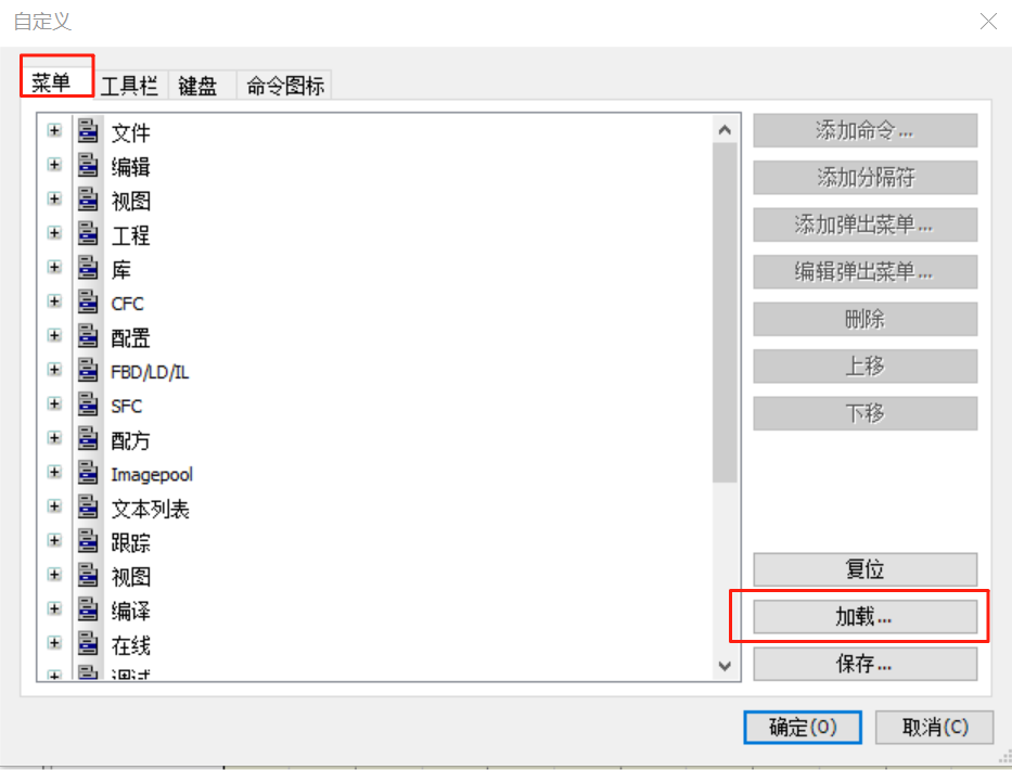 - 加载CODESYS.opt.menu 文件:点击菜单【工具】–>【自定义】
